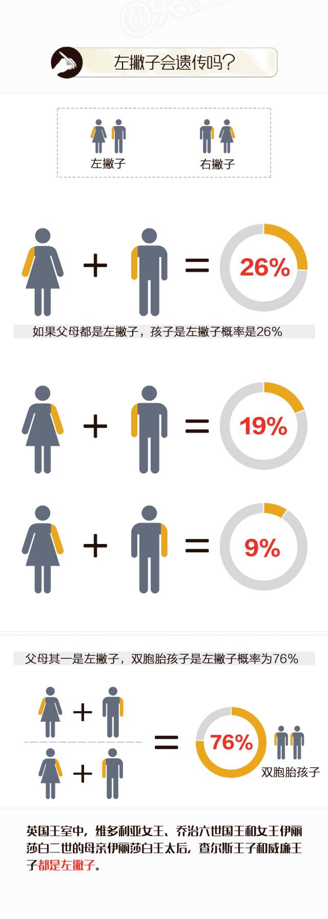 据估计,目前全球有10%-12%的人属于左撇子,中国的左撇子人数至少有8000万。而造成左撇子人数远少于右撇子的原因,TED的教育者Daniel Abrams认为,是源于人类进化过程中合作和竞争的压力所造成。