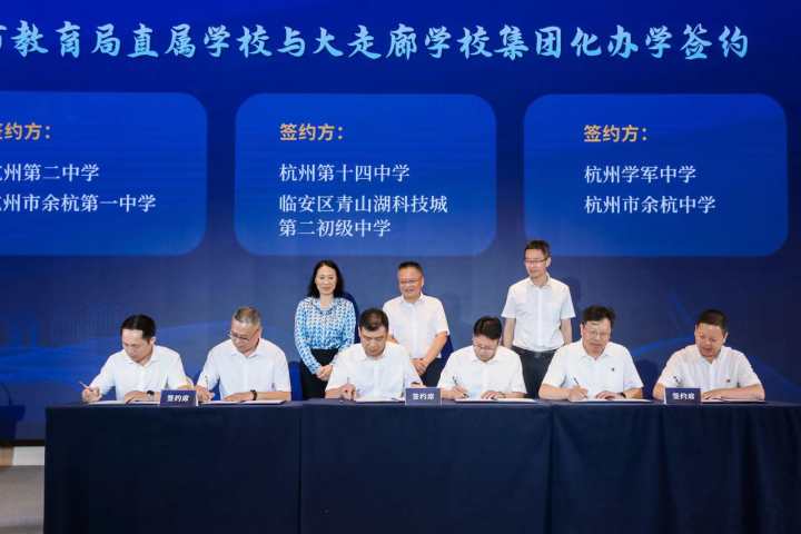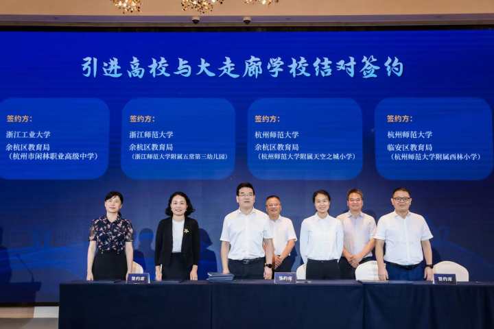发布会现场举行了签约仪式。浙江工业大学等高校与大走廊学校签约结对;杭二中、学军中学、杭州第十四中学等市教育局直属学校及有关城区学校与大走廊学校进行集团化办学签约。