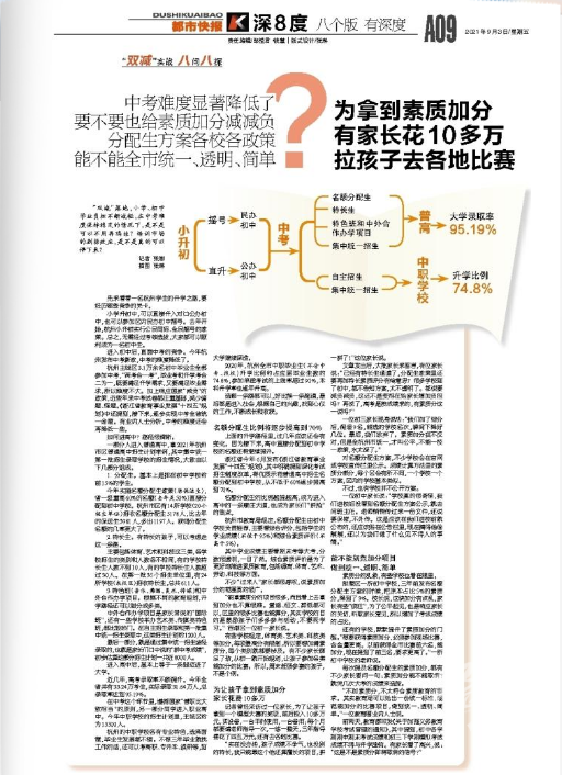 去年9月,快报推出8个版的“深8度”报道《“双减”实战,八问八探》,其中一版聚焦名额分配生素质加分乱象。其中提及了家长们最关注的有几个方面问题: