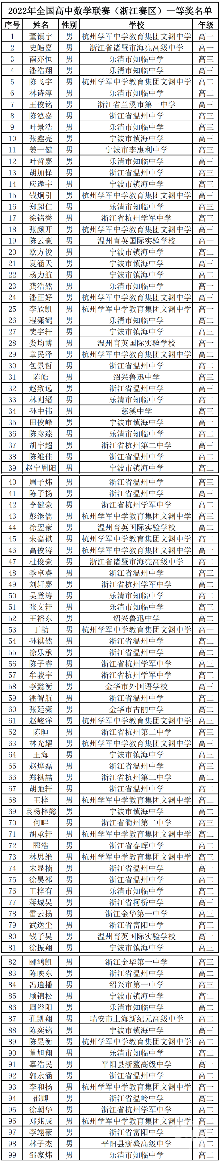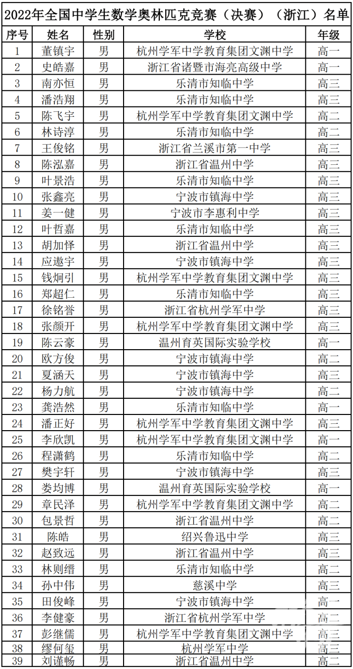 参加全国决赛的浙江省队共有39人,省一等奖共有99人。
