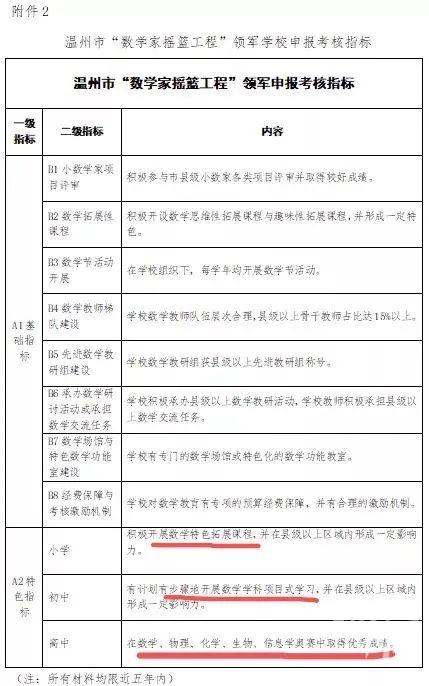 小学的考核指标是积极开展数学特色拓展课程,初中是有计划有步骤地开展数学学科项目式学习,高中是在数学、物理等五大学科竞赛中取得优秀成绩。