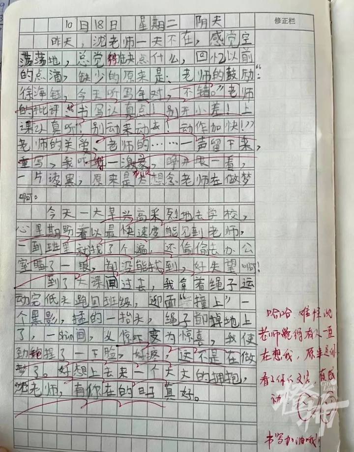 “孩子表达了那么深的想念,我得给他留一句话,同时也是鼓励他,希望能提升他写作的兴趣。”沈老师说,昨天发作文本时,自己特意把手机摄像头打开,对准了他,想看看他是什么反应。