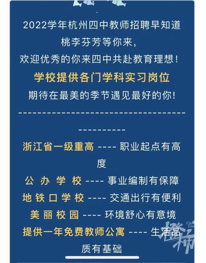 杭州第四中学前几天发出了招聘公告,学校提供了各门学科的实习岗位,包括语文、数学、英语、物理、化学、生物、政治、地理、技术、体育等学科,欢迎毕业生参与。