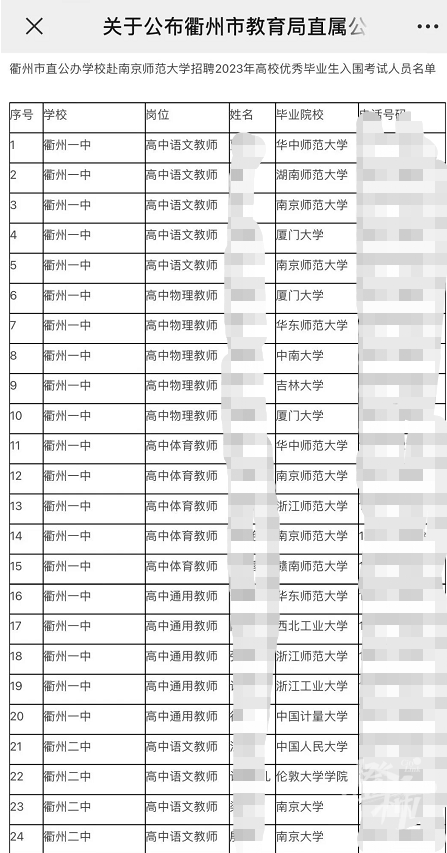 从入围考试的人员名单看来,吸引了不少名校毕业生,有南京师范大学、华东师范大学、北京师范大学、东北师范大学等多所知名师范院校,此外,还有复旦大学、浙江大学、厦门大学、南京大学等多所综合性大学。