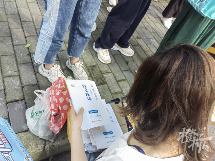的确,今年中考现场,记者曾看到有位妈妈把孩子送进去了,她在检查下午孩子参加社会开卷考试带的书够不够,老师也在帮忙清点。一个学期就至少有三本书,她带了六个学期的书,再加上练习册,厚厚的一叠,很重地拎在手里。