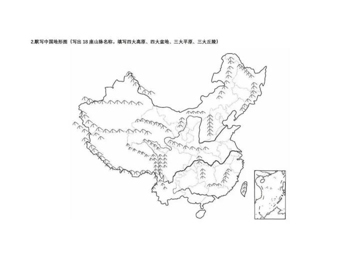 其实社会学科对学生的综合能力要求是很高的,比如地理就很考察读图识图能力。题目可能给你一个地方的降水量和蒸发量的图表,让你分析这可能是在中国哪个省份,这就要求对中国地形、气候等非常了解,并能灵活运用。所以,八年级现在在学中国地理,对地形的识别、行政区划、重要的山脉和气候类型等,都是要求学生熟记的,在这样的基础上,答题才会有速度。下面这张图就是学校发给学生反复练习记忆的地形图。