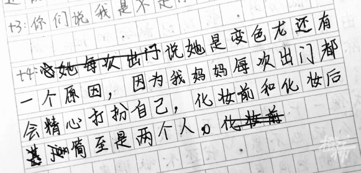 徐老师说,这个女生文笔还挺好的,对于情感的描写很细腻,一开始看到她的作文,很动容,但时间长了之后,徐老师也心生疑惑:怎么会有那么多不幸的事情发生在她家?老师忍不住去问了学生妈妈,妈妈很惊讶,说家里根本没有发生这样的事情。