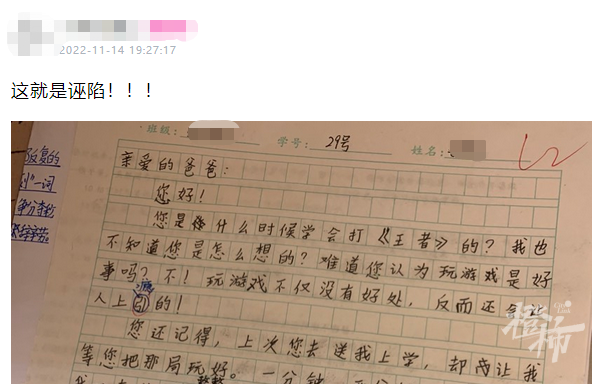 “没想到他会这么写我,玩游戏我确实在玩的,但根本没有写得那么过分。”毛爸说,孩子在做作业的时候,自己陪在边上,偶尔确实会玩一把游戏,也有过让他等一下,玩好这一把再辅导他做题的情况。