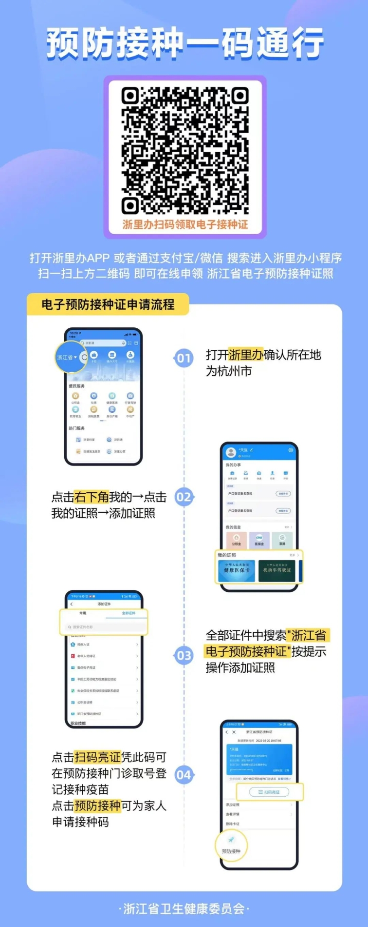 目前,杭州市已经实现成人电子预防接种证落地服务。成人电子预防接种证的申领非常简单,只需在手机上安装“浙里办”APP,就可以在“我的证照”里选择添加“浙江省电子预防接种证”,获得属于自己的电子预防接种证,全程操作不超过10秒。