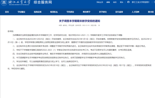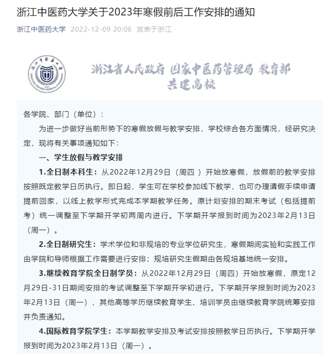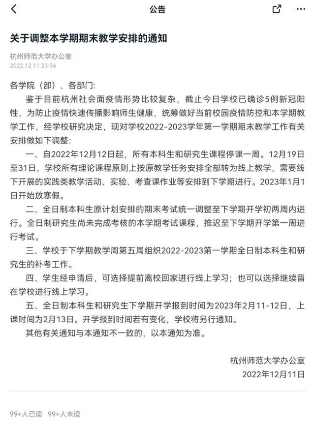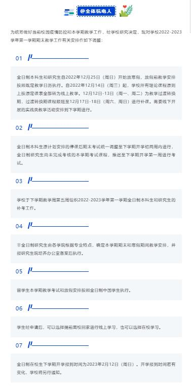 12月12日起,学校所有理论课程转为线上教学。本科生自12月25日开始放寒假,研究生2023年1月1日开始放寒假,期末考推迟至下周开学初两周内进行。