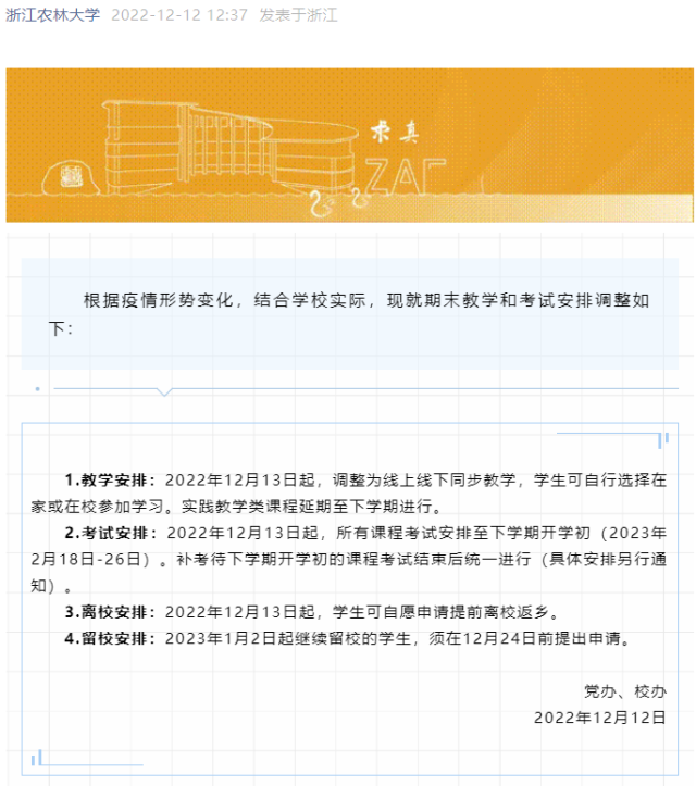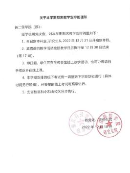 12月12日起所有本科生和研究生课程停课一周,12月19日至31日,学校所有理论课程全部转为线上教学,学生可回家或在校进行线上学习。2023年1月1日开始放寒假,期末考试调整至下周开学初两周内进行考试。
