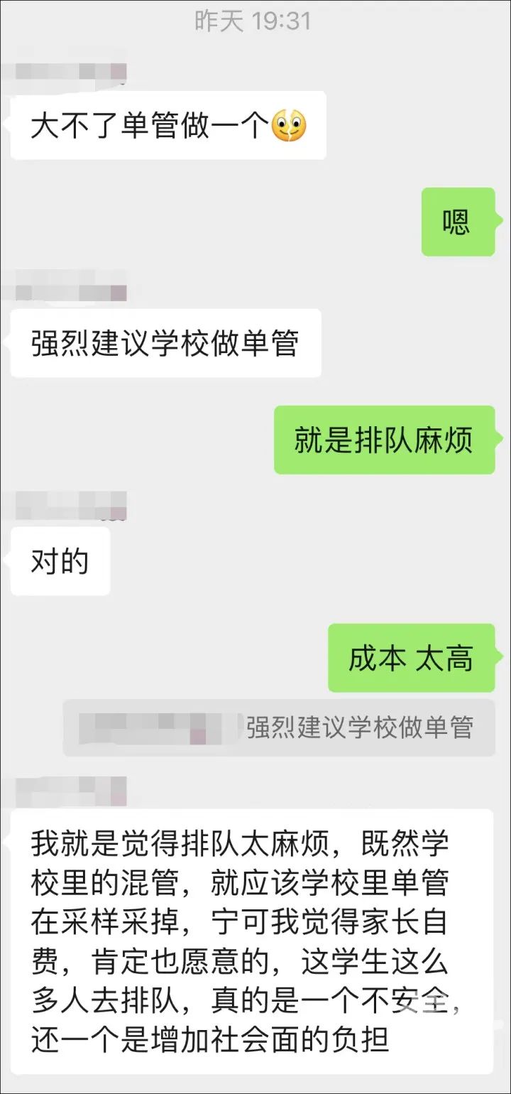 晚上7点多,核酸报告还是没出,沈女士说:“强烈建议学校做单管。既然学校里采样了,就应该单管,我觉得家长宁可自费,也愿意的。混检如果有阳性的,孩子还要再去做单管核酸。排队太麻烦,这么多混管阳性的一起,一个是不安全,一个是增加社会面的负担。”