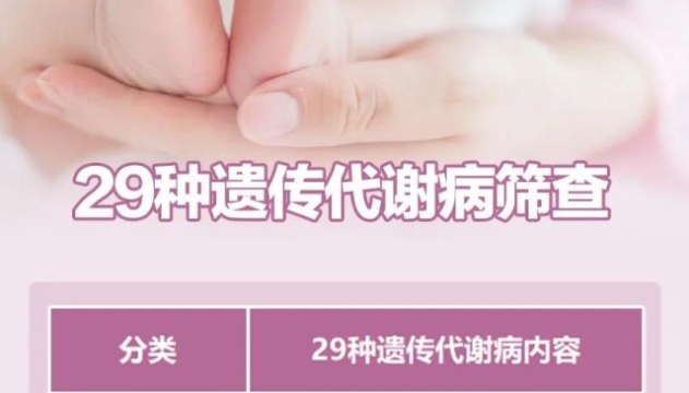 免费开展先天性甲状腺功能低下症、先天性肾上腺皮质增生症、葡萄糖-6-磷酸脱氢酶缺乏症和氨基酸代谢障碍、脂肪酸β氧化代谢障碍、有机酸代谢障碍等29种遗传代谢病筛查。
