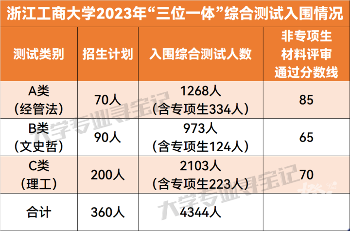 前段时间,浙江工商大学公布了今年“三位一体”综合测试的入围情况,详见下图。