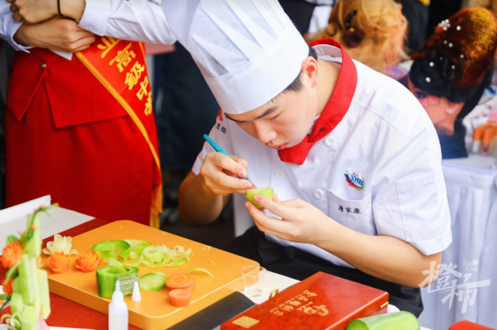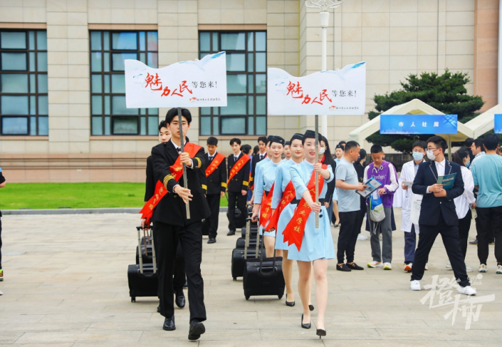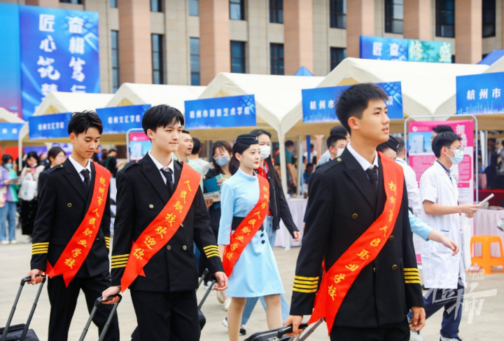 还有些学校把职业展示,直接送到人群中。杭州市人民职业学校空乘专业的十几位男女学生,身着制服、拖着行李箱,自信地绕场而过,吸引不少家长,拿起手机一顿猛拍。“气质真当好的!”一位爸爸说。