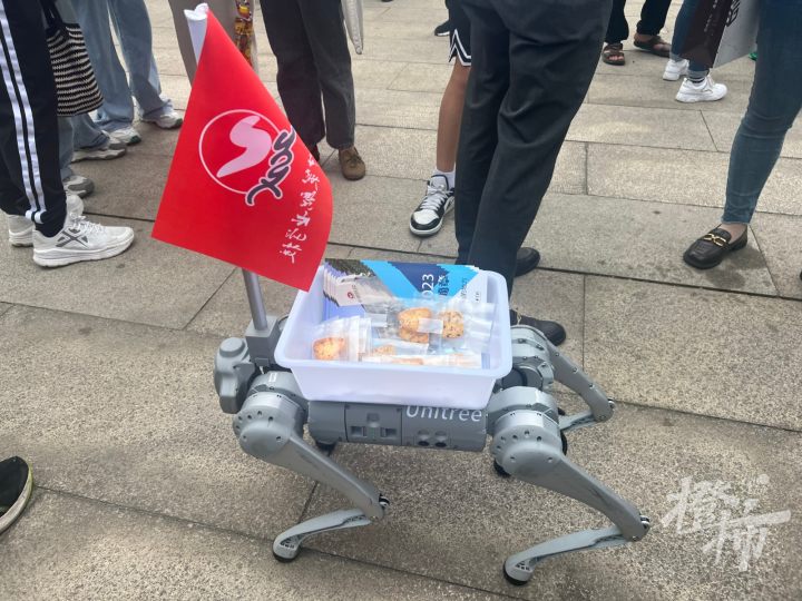 人群中还有一只机器狗,成了明星。这是中策职校电气专业的“网红”,只见它不断展示着踱步、后退、转圈等动作,吸引大家来取他背上的招生简章,和由中西点专业学生制作的小饼干。围观的人群里,不断发出笑声和欢呼声。