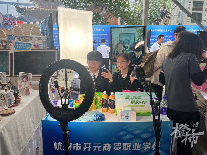 “321,链接已经上了,大家快拍!”杭州市开元商贸职业学校电子商务专业的两名学生,在现场摆了一个直播间。