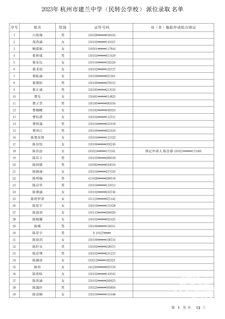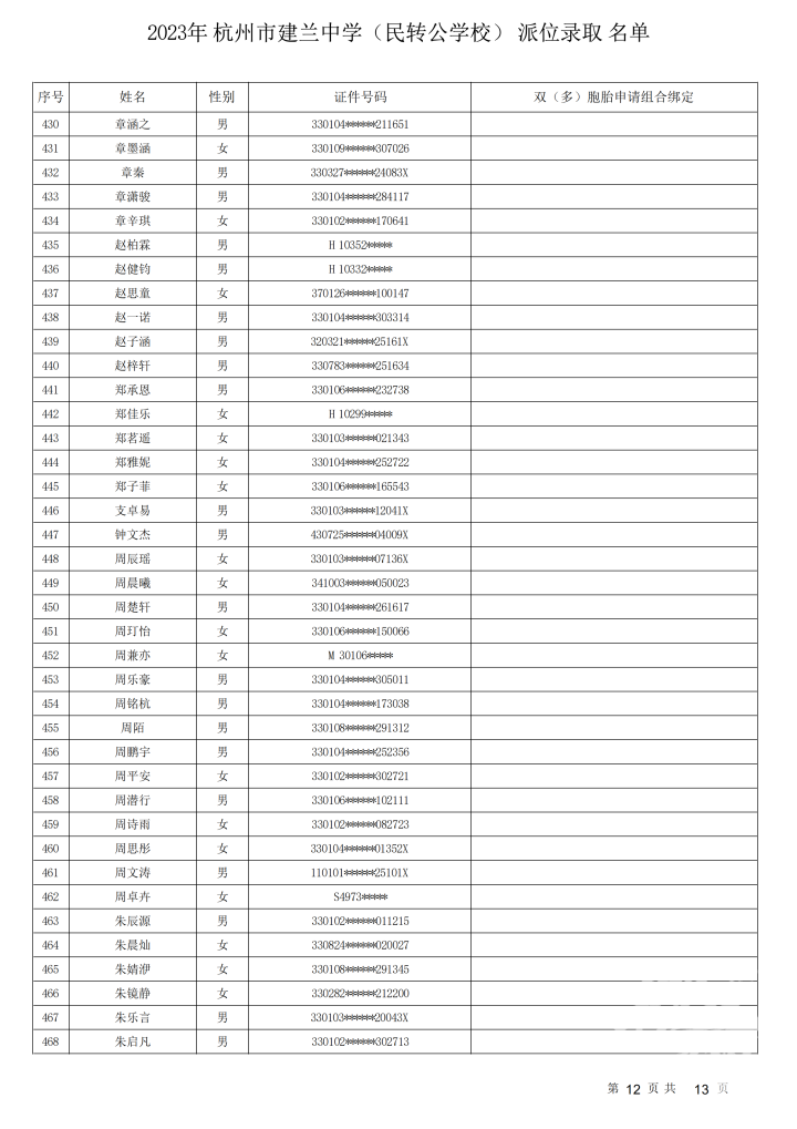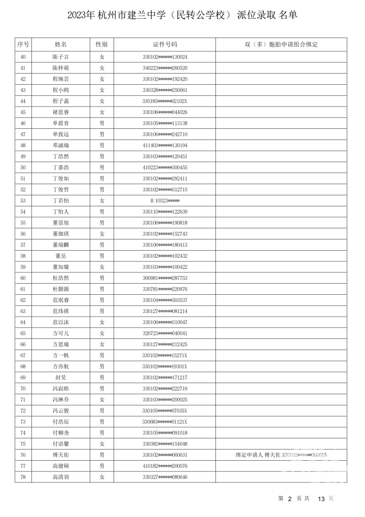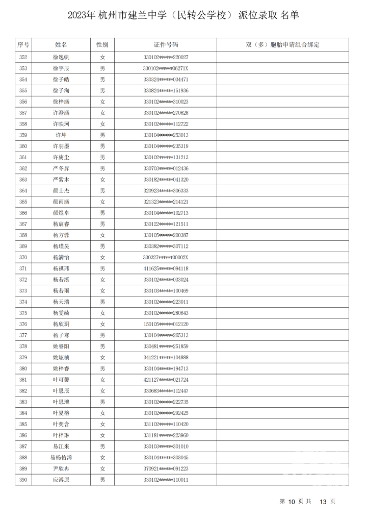 杭州市建兰中学(民转公学校)录取名单出炉