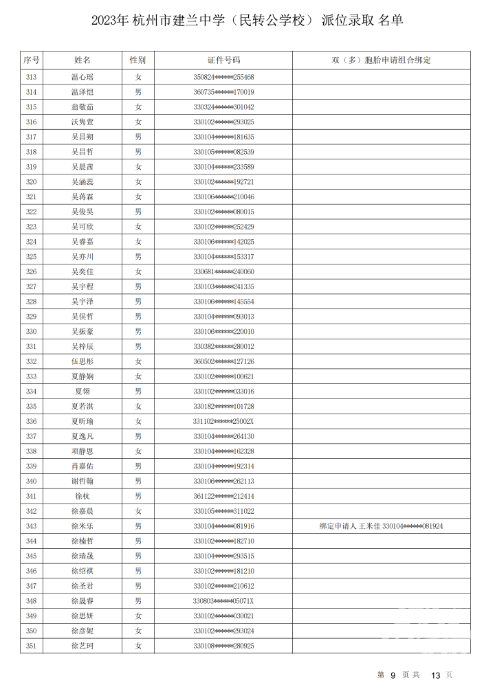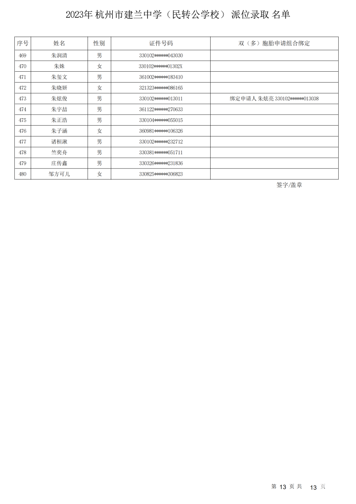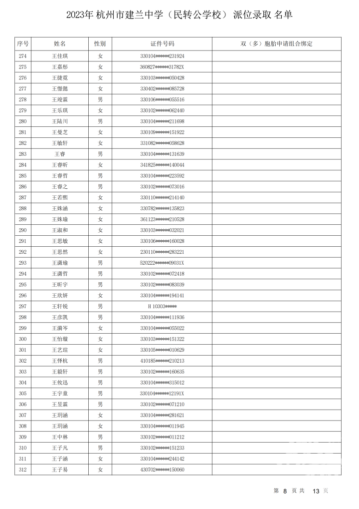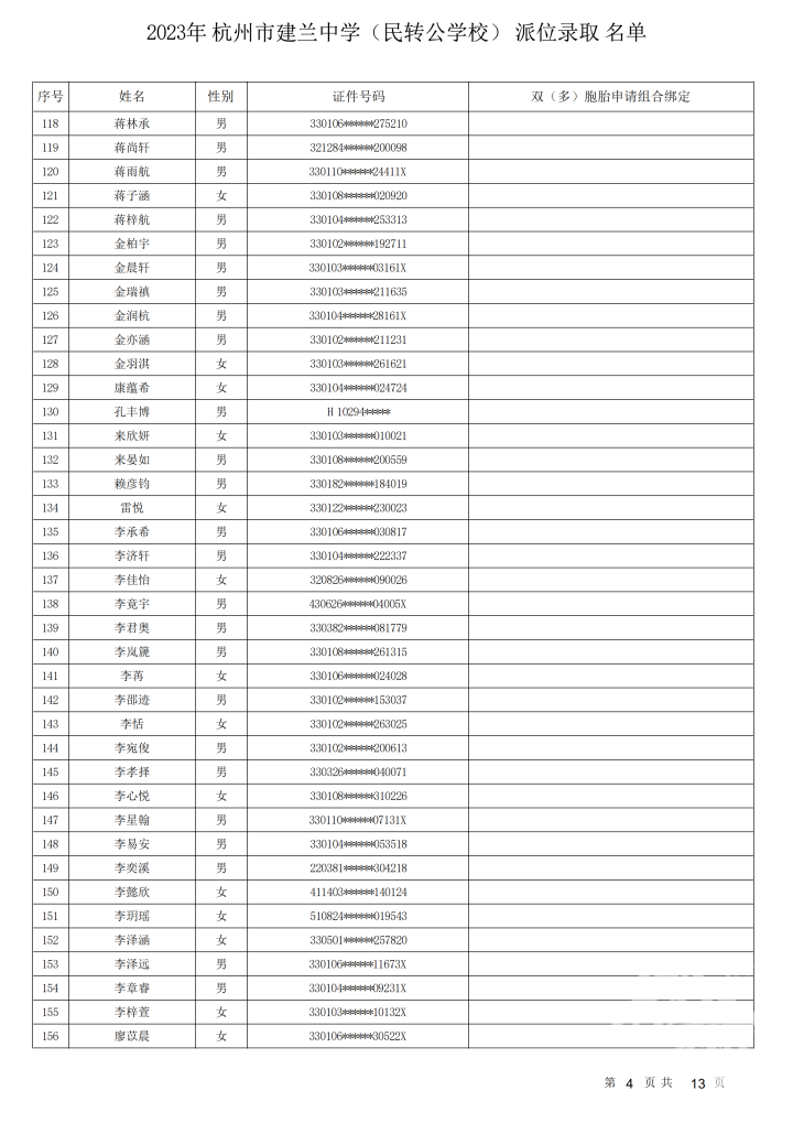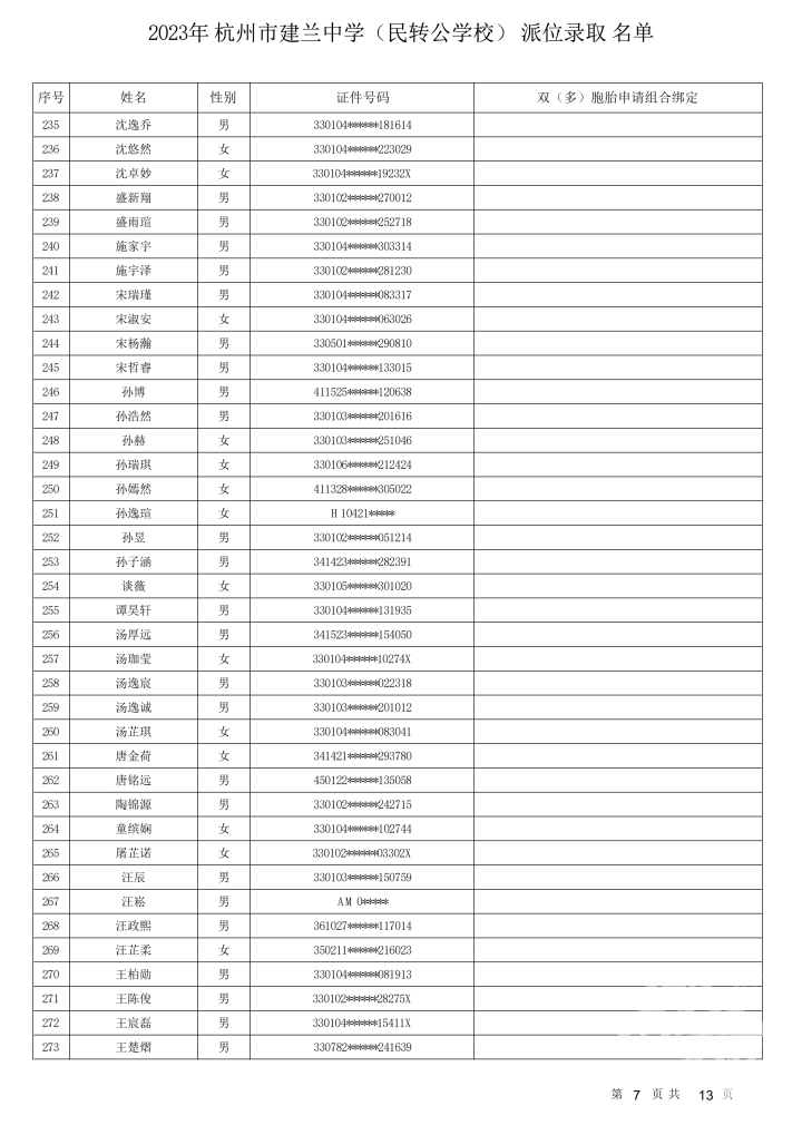 杭州市建兰中学(民转公学校)录取名单出炉