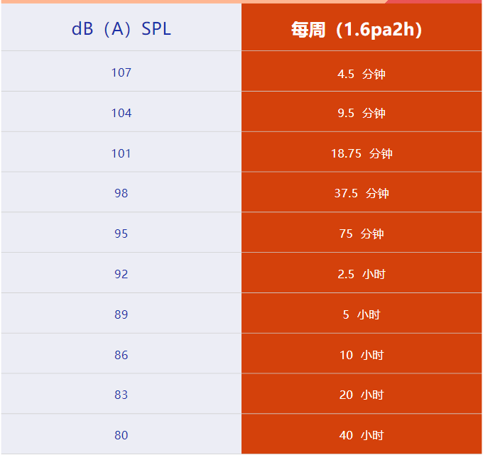 关于如何正确使用耳机,世界卫生组织(WHO)已提出明确的建议:成年人使用耳机声强80分贝(dB SPL)时,每周不应超过40小时;如果耳机声强超过80分贝(dB SPL),则使用时间应相应缩短。例如,耳机声强为101分贝(dB SPL),则每周使用时间就不宜超过18.75分钟(如下图)。