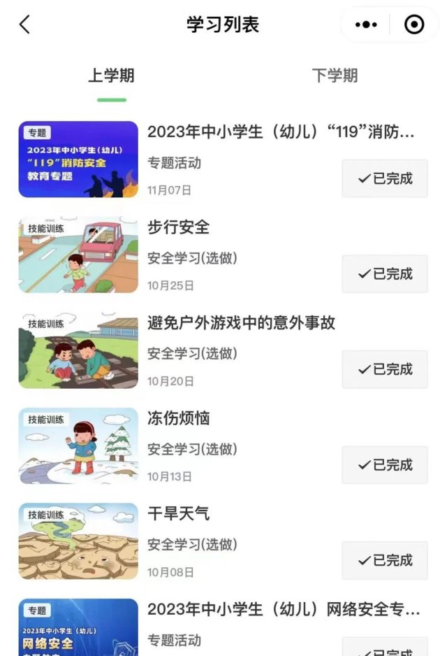 记者了解到,“安全教育平台”不用每天打卡,只有相应任务发布时,才需要完成。张女士展示了她最近完成的两期任务,分别发布于10月25日和11月7日。“我觉得内容还蛮好的,还是以动画视频的形式呈现,符合孩子的口味。但往往通知紧急,孩子平常学习任务又重,我们也担心电子屏幕上看久了影响孩子视力,所以大部分的学习,都是我们家长代劳。”