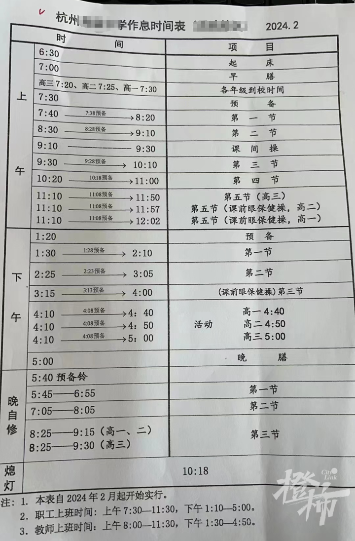 杭州一所重点高中的高一女生小飞妈妈,给橙柿互动记者发来一张最新的学校作息时间表——