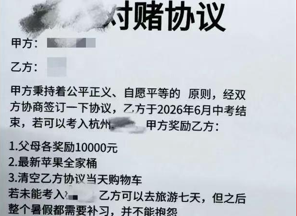 杭州家长圈流行签订“对赌协议”吗?潮新闻·钱江晚报记者询问了多位初中班主任,表示虽然身边没听说,但不排除会有家长采用与孩子签订考学奖惩协议的方式。采访中很多家长表示,虽然没有白纸黑字签订过“对赌协议”,但口头承诺曾有过。