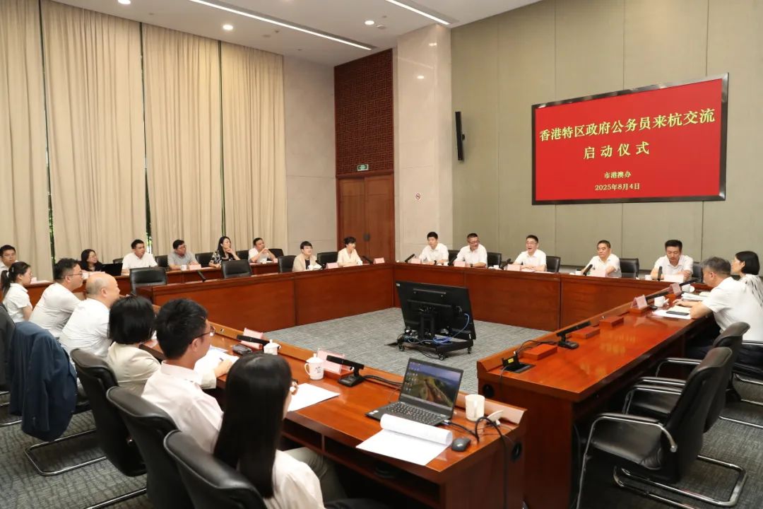 8月4日,2025年香港特区政府公务员来杭交流启动仪式在杭州市民中心举行。杭州市委组织部、杭州市港澳办及市政府有关部门领导参会。来自香港特区政府路政署、康乐及文化事务署两位来杭交流的香港公务员到会作情况介绍。香港特区政府驻浙江联络处主任刘铭德应邀到会讲话。与会人员齐聚一堂,共话城市治理经验,开启了两地公务员深度交流的新篇章。