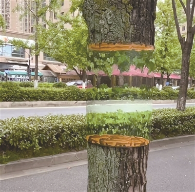开学前这些天,“杭州画画的老俞”连续在社交平台发帖,他在中小学门口附近,用手中的画笔让一段树干凭空“消失”。