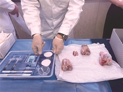 浙大邵逸夫医院骨科医生用猪骨现场演示“骨02”接骨。 记者 金晶 摄