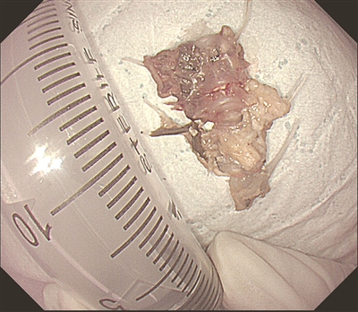 解道宇第一时间联系内镜中心,安排胃镜下急诊取异物。消化内科李为民主治医师在距门齿约23厘米处准确找到了这根多节的鱼骨并稳稳取出,整个操作过程仅用了不到10分钟。取出后测量,这块鱼骨(3-4节脊柱骨)竟长达三四厘米!
