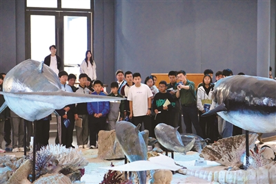 而在展厅另一端,鼬鲨的齿列模型同样引人注目。那是一件进化完美的“活体圆锯”——每年自动更换上千颗锯齿状尖牙,终身保持极致锋利。鲨鱼的洛伦氏壶腹、中国鲎的复眼、鼬鲨的牙齿……这些历经亿万年打磨的生存智慧,正为人类的科技创新提供着永不枯竭的灵感。这正是“新质生产力”最动人的打开方式——向大海取经,为未来赋能。