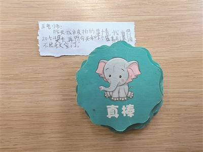 还记得今日清晨的讲台吗?一叠整齐的奖卡静静躺在那里,我起初以为是哪位同学来兑换积分,走近才发现,奖卡下压着一张小小的纸条,上面的字迹工工整整:“王老师,昨天我被拍的事情,我自罚20个奖卡,再罚今天和下个星期课间不出教室门。”落款处,是你们熟悉的名字。