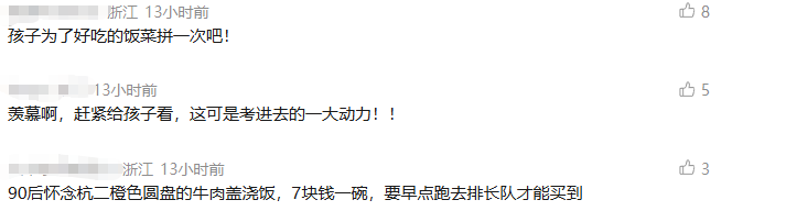 这么多食堂美食引得网友纷纷“回忆杀”了起来。有90后网友说:“怀念杭二橙色圆盘的牛肉盖浇饭,7块钱一碗,要早点跑去排长队才能买到。”