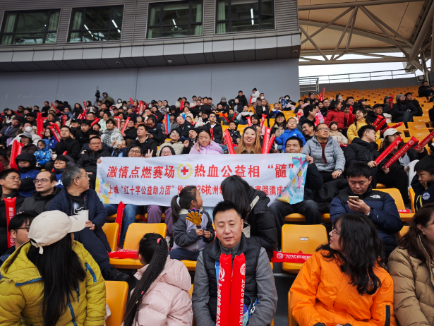 今天上午,2026杭州足球联赛开幕式在上城体育中心火热举办。上城区红十字会组建由无偿献血和造血干细胞捐献志愿者组成的“红十字热血公益加油团”现场观赛助威。红十字志愿者们把曾为生命续航的热血担当,转化为赛场助威的磅礴动力,高呼“热血为球赛加码,公益为城市添彩”,成为赛场一道靓丽的人道风景线。两种热血激情同频共振、既彰显了上城共富工坊、公益服务等民生载体的实效,也让捐献者群体的大爱付出感染每一位观赛者,更展示上城“体育+公益”的独特城区人道气质。