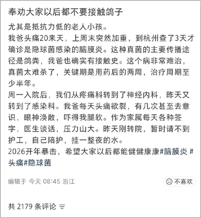 “我爸头痛二十来天,上周末突然加重,到杭州查了3天才确诊是隐球菌感染的脑膜炎。这种真菌的主要传播途径是鸽粪,我爸也确实有接触史。这个病非常难治,真菌太难杀了,关键是用药后的两周,治疗周期至少半年……”近日,有网友在社交平台发文,“奉劝大家以后都不要接触鸽子,尤其是抵抗力低的老人和小孩”。