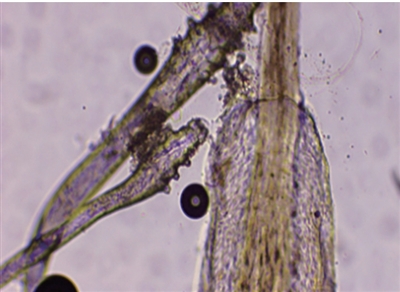 显微镜下,患者睫毛上的螨虫(白圈内)清晰可见。 医院供图