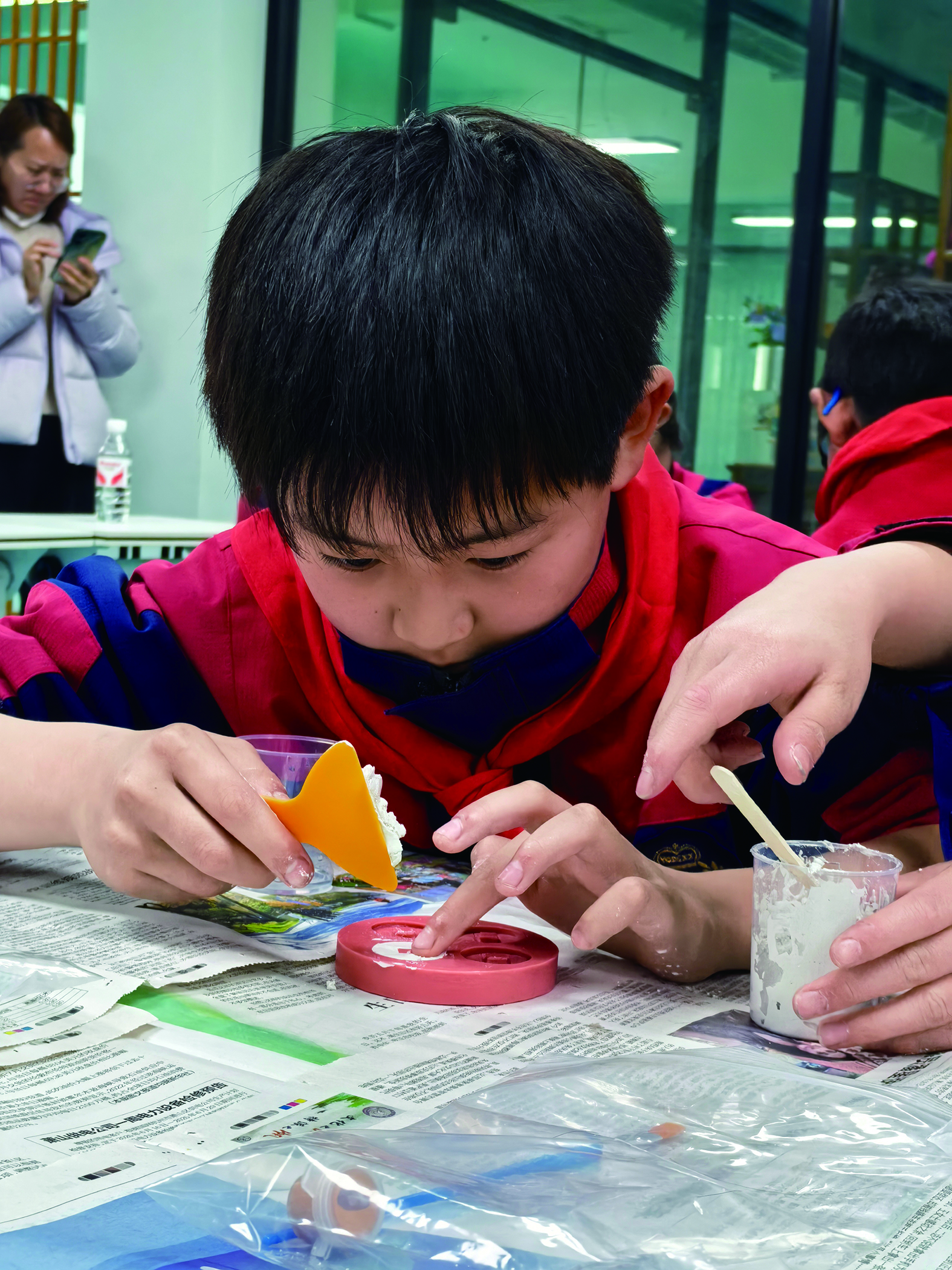 尽管有老师的细致指导,但实际操作起来,还是有不少孩子遇到了难题:有的因为材料调制过稠,无法顺利倒入模具;有的脱模时不小心碰掉了边角,看着不完整的作品,小脸上露出了失落的神情。察觉到孩子们的情绪,博物馆的老师们立刻温柔上前,一边轻轻安抚,一边鼓励道:“没关系,动手实践就是这样,难免会有小失误,重要的是我们学到了知识、感受到了乐趣。”