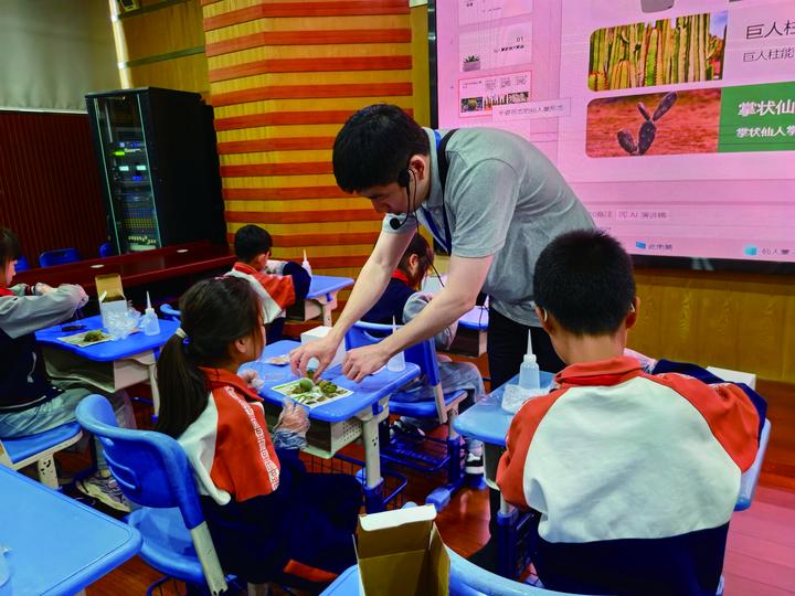 “仙人掌是适应干旱环境的典型植物,品种繁多,形态千姿百态,但大致上可以分为球状、柱状和掌状三类。仙人掌的叶片退化为刺,可以减少水分蒸发;根系浅而广,能快速吸收零星水分。那么问题来了,既然叶片变成了刺,仙人掌是如何进行光合作用的呢?”随着唐乐宁老师逐渐深入地讲述,仙人掌这一植物的神奇之处被慢慢展示在了孩子们的面前。