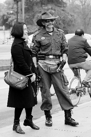 昨日,杭州北山路上,一位留着八字胡的男士手拿雪茄,头戴牛仔帽……一身美国西部行头为他争得了不少回头率,一些游客还兴冲冲地跑上去与他合影。