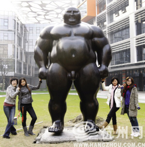 走进阿里巴巴滨江园区,远远就能看见这个大家伙矗立在广场中央。你别说,他还挺有人缘,走过的员工都会拿出手机拍照留念。阿里巴巴员工李子涵说:“这个雕像刚装起来,上个星期五下班的时候还没有,我们大家都喜欢的,还给他取了个绰号,叫‘大块头’。”