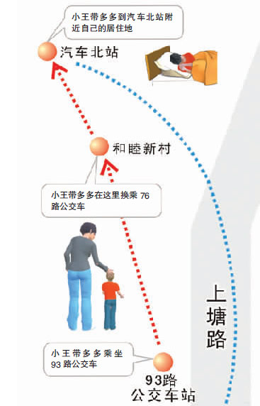 “后来我女儿要回家,已经是晚上7点多了,我没办法,就带他一起回家了。坐93路车,到和睦新村,转76路到汽车北站。