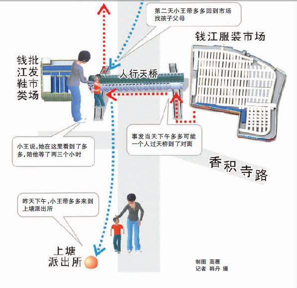 “我看没有大人在边上,就把他叫过来。我带着女儿,还有他,站在天桥上面,等他们家的大人来找他,一直等了两三个小时……