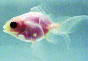 央视4套2010年1月30日报道:日本三重大学田丸浩副教授用3年时间,利用基因突变的浅色金鱼培育出透明金鱼,可看到内脏和血液状态,今后有望应用到医学研究中。