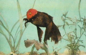 “我用紫鱼和红高头交配,弄出个鱼,全身都是浓紫色,头上肉瘤是鲜红色,开始我叫它们‘紫色红头’。“这种鱼非常不稳定,养上一段时间,紫色全褪成了红色,最后只剩下一尾雄鱼不褪色,纯种的。更稀奇的是,养了两年多,它相貌儿变了,嘴巴长出一圈黑色,眼睛上也出来一圈黑色,鼻膜也黑了一道。看上去有眉毛、有眼睛、有嘴巴,面孔像个小娃娃!