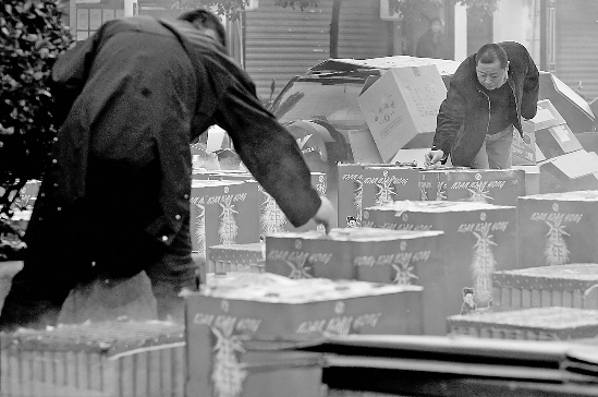 这厢阵势庞大,那厢也不甘示弱。路对面的中信银行也拉开了架势,一群工作人员摆出了4只88响的大礼花,“恭喜发财”、“财源滚滚来”、“招财进宝”、“福满门”,地上还摆出了10条红色长鞭炮,每条足有10来米长。为了燃放方便,他们还把10条鞭炮接在了一起。