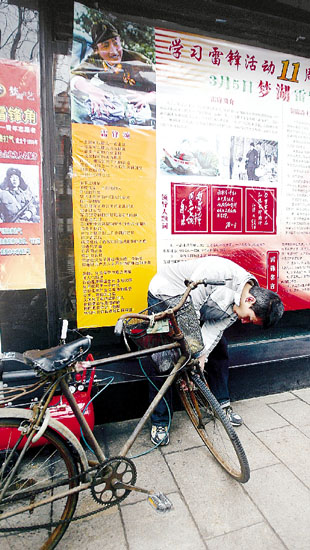为迎接今年“学雷锋”日的到来,店里还专门挂出了巨幅雷锋宣传画。赵老板说:“大家打完气,一抬头就能看到雷锋和他的精神,就当是公益广告吧。”