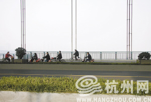 新闻背景:要想骑车过江,那就必须上桥。通往市区能骑车的有一桥和四桥。钱江一桥的非机动车道路面不宽,两辆自行车或电动车并行时就显得拥挤了。网友“消失的地平线”说:一桥的非机动车道铺的是青瓷砖,下雨天别说骑车了,即使走在上面都觉得滑。