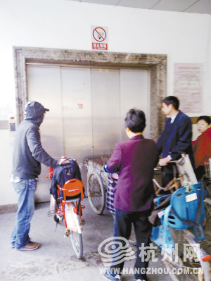 8点07分,上桥的电梯口停着8辆自行车和电动车。目测了一下,电梯大约6平方米,停5辆车就满了。李师傅说,7点多的时候,车子都排到门外去了。有些人等不及下一班电梯,索性就把小车举在头顶走楼梯。