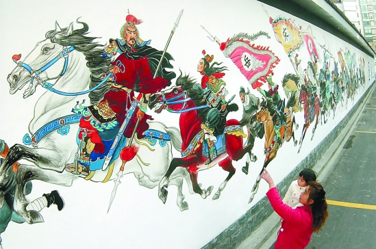 打铁关路的一堵白墙上,还有岳飞抗金的彩绘长卷。 祁砚青 摄